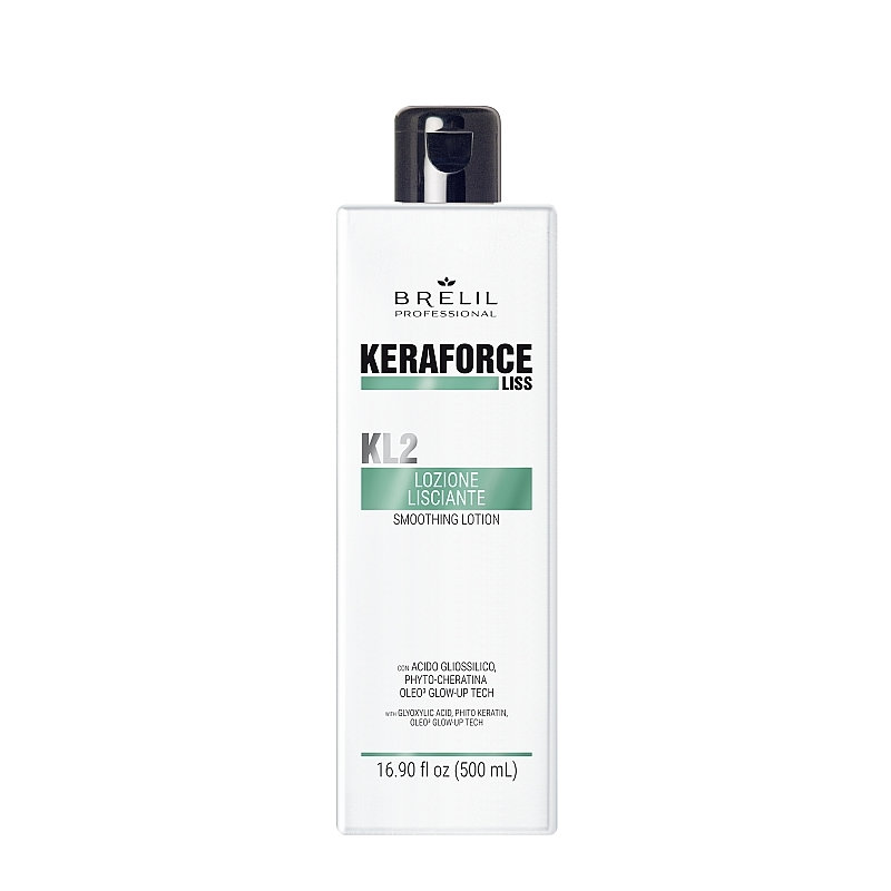 Розгладжувальний лосьйон Brelil Keraforce Liss KL2 Smoothing Lotion тільки для професійного використання. Формула на основі гліоксилової кислоти, яка має властивості проти пухнастості, розгладжує та зменшує об'єм, збагачена Phyto Keratin та Oleo Glow-up Tech, а також сумішшю олій тамаринду, шикакай та кокосу, поєднує в собі пом'якшувальні та живильні властивості, надаючи волоссю сяючого та шовковистого вигляду. Технічний розгладжувальний засіб ідеально підходить для натурального або обробленого, кучерявого та неслухняного волосся і призначений лише для професійного використання. Він дозволяє отримати тривалий природний гладкий вигляд та зменшити надмірний об'єм і пухнастість, надаючи волоссю сяйва та шовковистості. Він робить волосся легким для розчісування та слухняним, навіть удома. Помірно піниться.