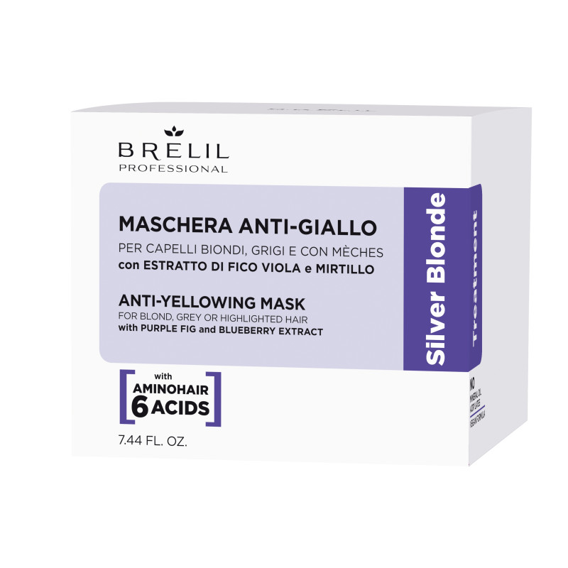 Brelil Anti-Yellow Mask Silver Blonde - маска проти жовтизни для світлого та мелірованного волосся. Її формула підсилює колір світлого і сивого волосся, надаючи яскравості холодним відблискам і інтенсивно протидіючи жовтизні; водночас розплутує волосся і робить його м'яким.